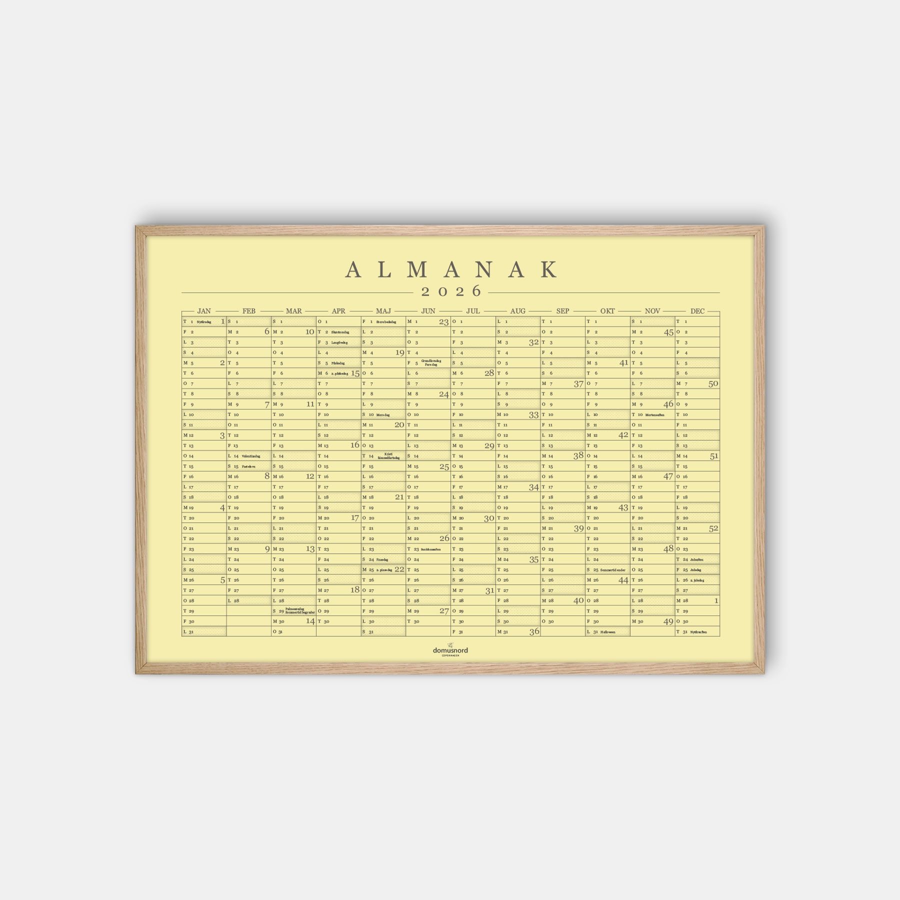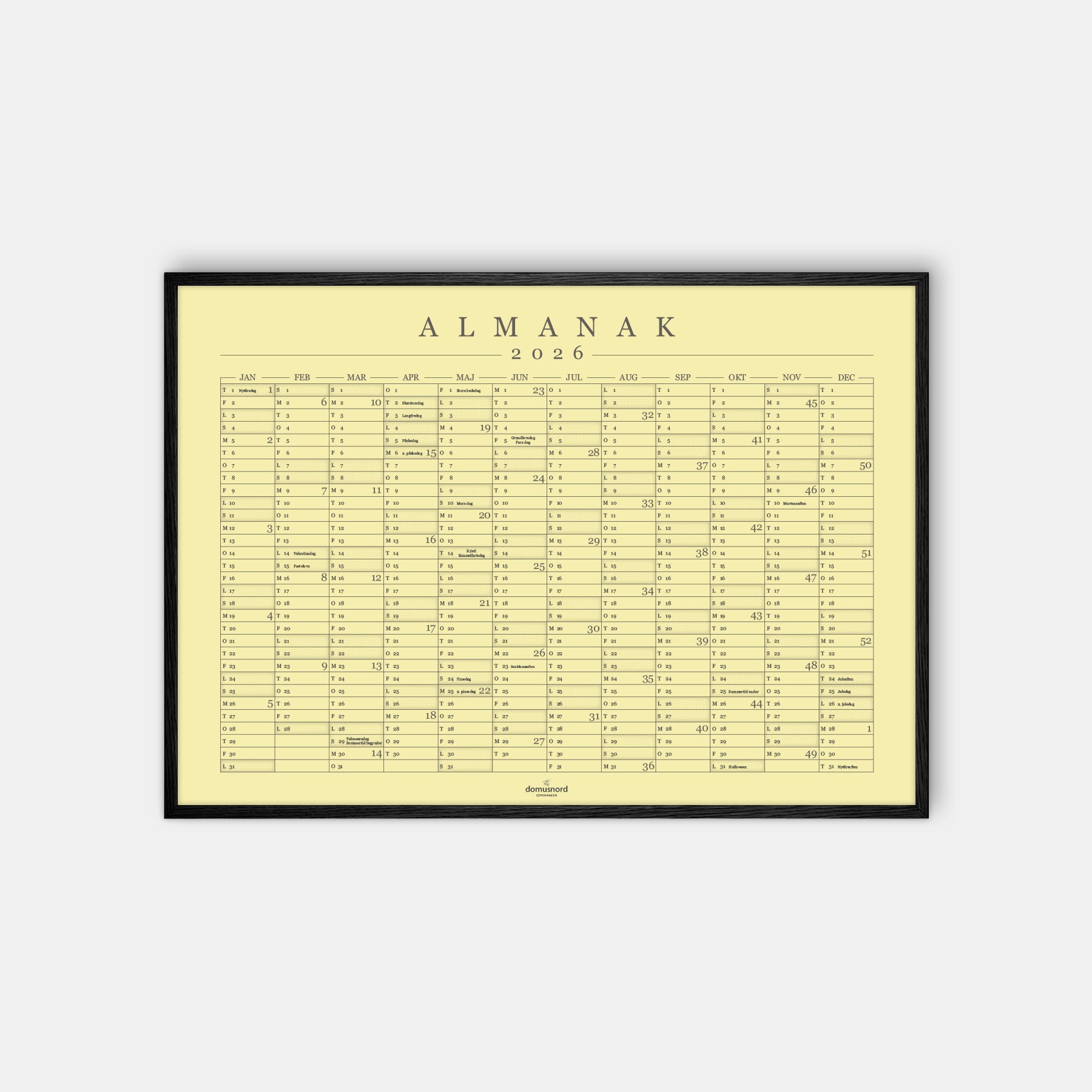 Domusnord Copenhagen har designet en flot og stilfuld kalender til hjemmet eller kontoret med ugenumre. Navnet er Almanak, da kalenderen indeholder alle årets helligdage og udvalgte mærkedage som fx fastelavn, mors dag, sankthans samt sommertid. Med tiden indeholder den også en oversigt over dine personlige mærkedage. Kalenderplakaten for 2026 kan anvendes både med og uden ramme. Ved køb med indramning leveres plakaten i ramme med glas eller plexiglas, så man evt. kan skrive direkte på glasset med ikke-permanent tusch (medfølger ikke). Kalenderplakaten kommer i 9 forskellige dekorative Pantone farver samt i målene 50x70 cm og 70x100 cm. Årskalenderen Almanak er inspireret af formsproget i klassisk dansk design og funktionalisme.