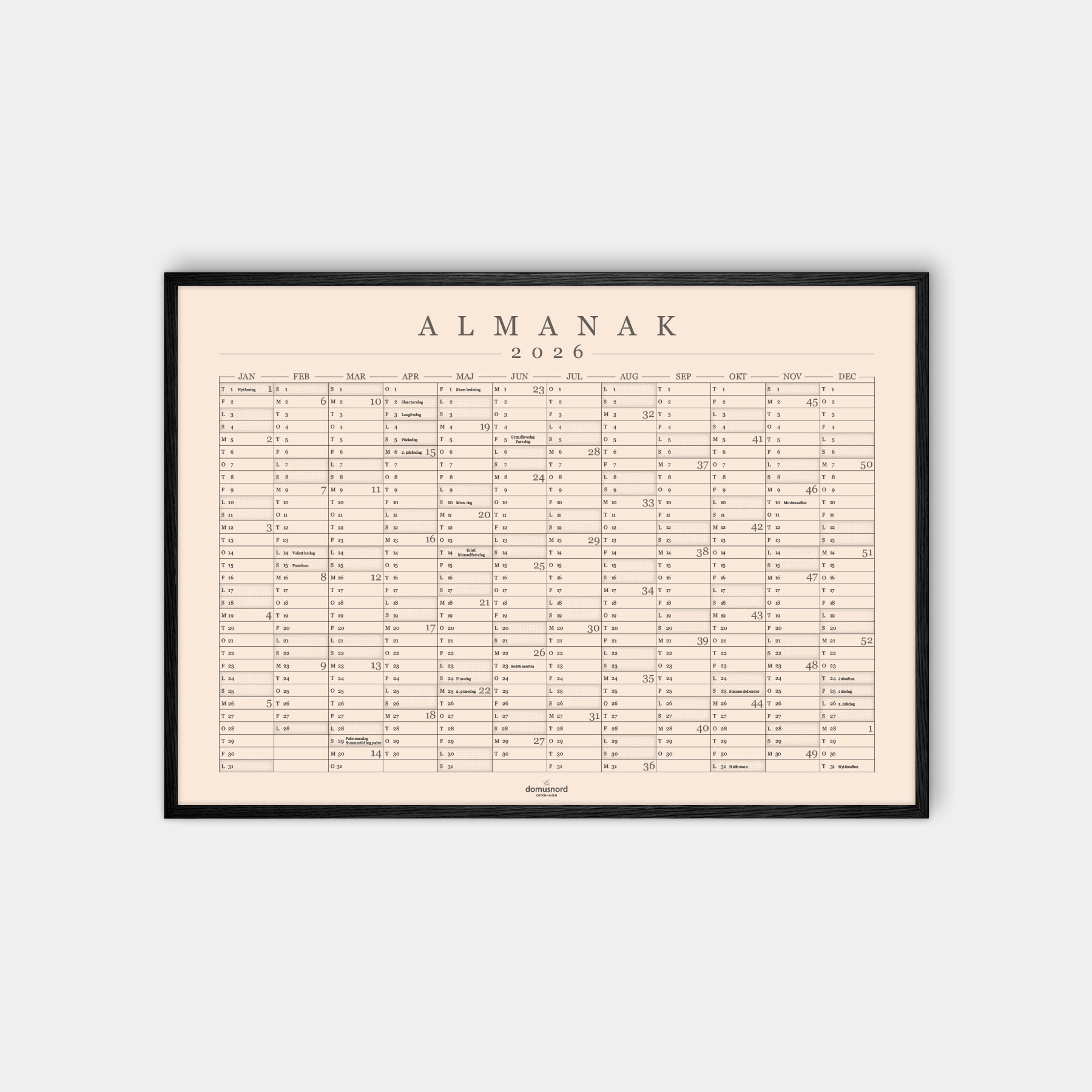 Domusnord Copenhagen har designet en flot og stilfuld kalender til hjemmet eller kontoret med ugenumre. Navnet er Almanak, da kalenderen indeholder alle årets helligdage og udvalgte mærkedage som fx fastelavn, mors dag, sankthans samt sommertid. Med tiden indeholder den også en oversigt over dine personlige mærkedage. Kalenderplakaten for 2026 kan anvendes både med og uden ramme. Ved køb med indramning leveres plakaten i ramme med glas eller plexiglas, så man evt. kan skrive direkte på glasset med ikke-permanent tusch (medfølger ikke). Kalenderplakaten kommer i 9 forskellige dekorative Pantone farver samt i målene 50x70 cm og 70x100 cm. Årskalenderen Almanak er inspireret af formsproget i klassisk dansk design og funktionalisme.